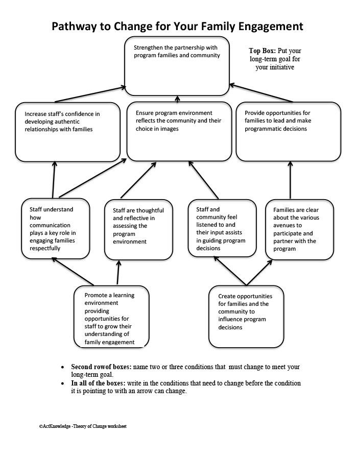 Once providers identified outcomes, they looked at the necessary preconditions to help them get to these outcomes and focused on alignment between vision, mission, to outcomes and then to program and activities. As the conclusion of the Practitioner Network, providers developed a blueprint for their family engagement efforts. Below is a visual illustration of the TOC: